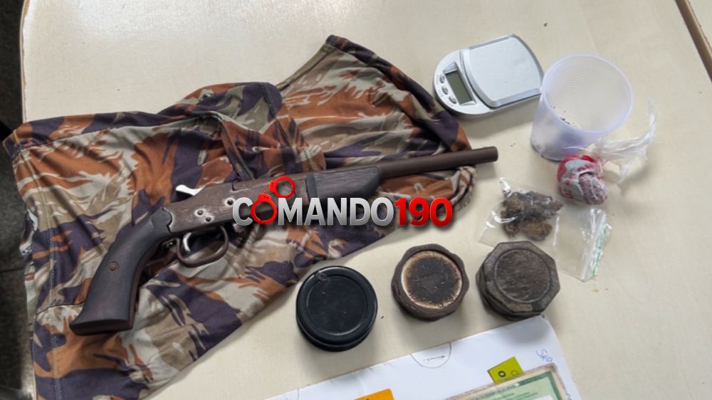 Com o auxílio do cão farejador, os policiais localizaram mais entorpecentes e uma arma de fogo calibre .22, de fabricação caseira, sem numeração aparente, além de dois aparelhos celulares e uma motocicleta, que também foi apreendida.