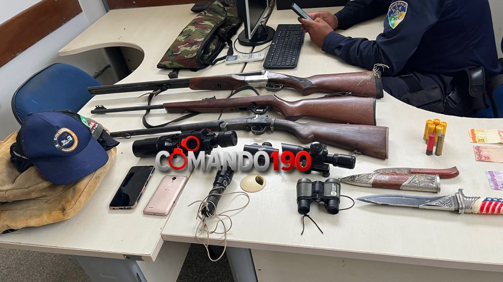 No ponto indicado, os policiais encontraram três armas de fogo, sendo duas pertencentes à vítima — um rifle calibre .22 e uma espingarda calibre 20 —, além de uma terceira arma sem numeração visível e diversos cartuchos intactos.