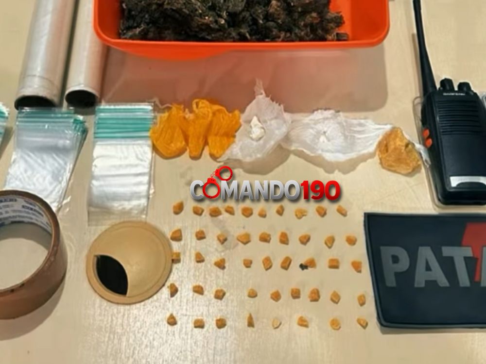 Também foram encontradas porções de maconha, crack e cocaína, armazenadas de forma organizada em potes distintos. Diante dos fatos, foi dada voz de prisão ao envolvido, que foi encaminhado à delegacia juntamente com todo o material apreendido.