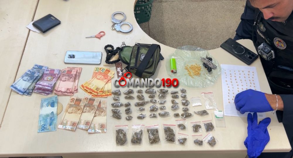 Durante a abordagem, os policiais encontraram com Everton Gabriel de Lima Silva uma pochete contendo diversas porções de drogas já prontas para venda. No total foram apreendidas 46 porções de maconha, duas porções de cocaína e cerca de 175 pedras de crack, além de aproximadamente R$ 546 em dinheiro, em cédulas de diferentes valores.