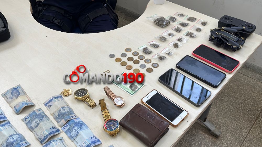 Durante buscas na residência, os policiais localizaram diversas porções de droga prontas para comercialização, dinheiro em espécie, celulares, joias, relógios e até um drone, que estava escondido dentro de uma bolsa sobre a geladeira. Um terceiro indivíduo, Pablo, também foi abordado no local com dinheiro e celular, relatando que teria ido até a residência com a intenção de comprar entorpecentes.