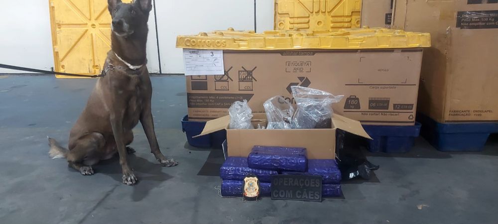 No interior do depósito, foi realizada uma inspeção preliminar da encomenda suspeita. Durante o procedimento, a cadela de faro K9 Samy apresentou reação ativa característica de detecção de entorpecentes, indicando a presença de substância ilícita no volume.