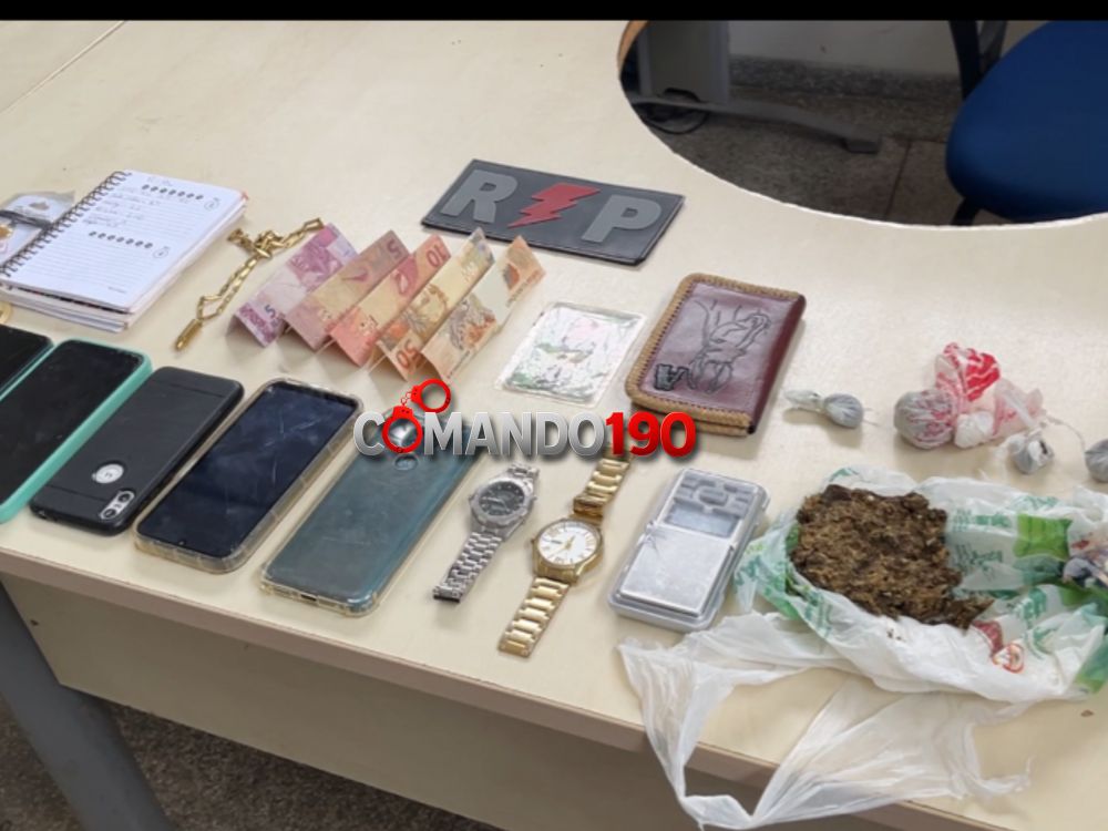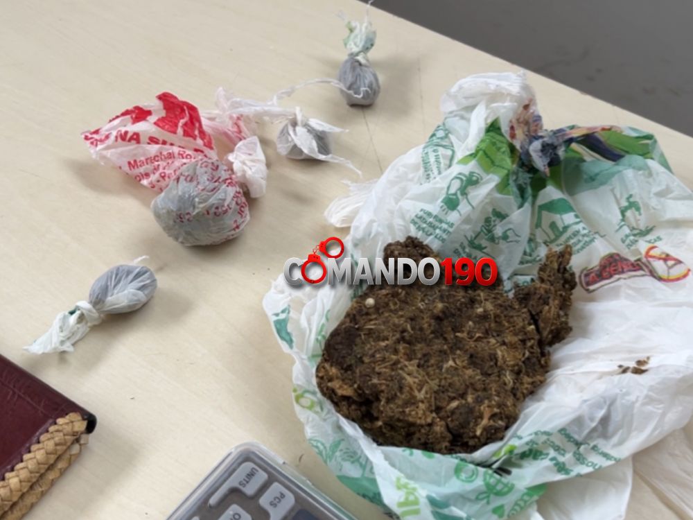 Na casa denunciada, os policiais localizaram o casal Marcos e Rafaela. Logo na sala, dentro de uma bolsa preta, foi encontrada uma porção de maconha. Durante buscas pelo imóvel foram apreendidas mais quatro trouxinhas da droga, além de uma balança de precisão, dinheiro, anotações de contabilidade do tráfico, quatro celulares, um televisor, relógios, correntes, bijuterias e duas botijas de gás de origem duvidosa.