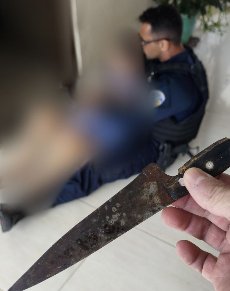 Ao chegar ao endereço indicado, a guarnição constatou que o portão da residência estava aberto. No interior do imóvel, os policiais visualizaram a mulher em forte abalo emocional, chorando intensamente e segurando uma faca.