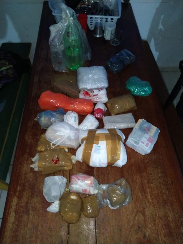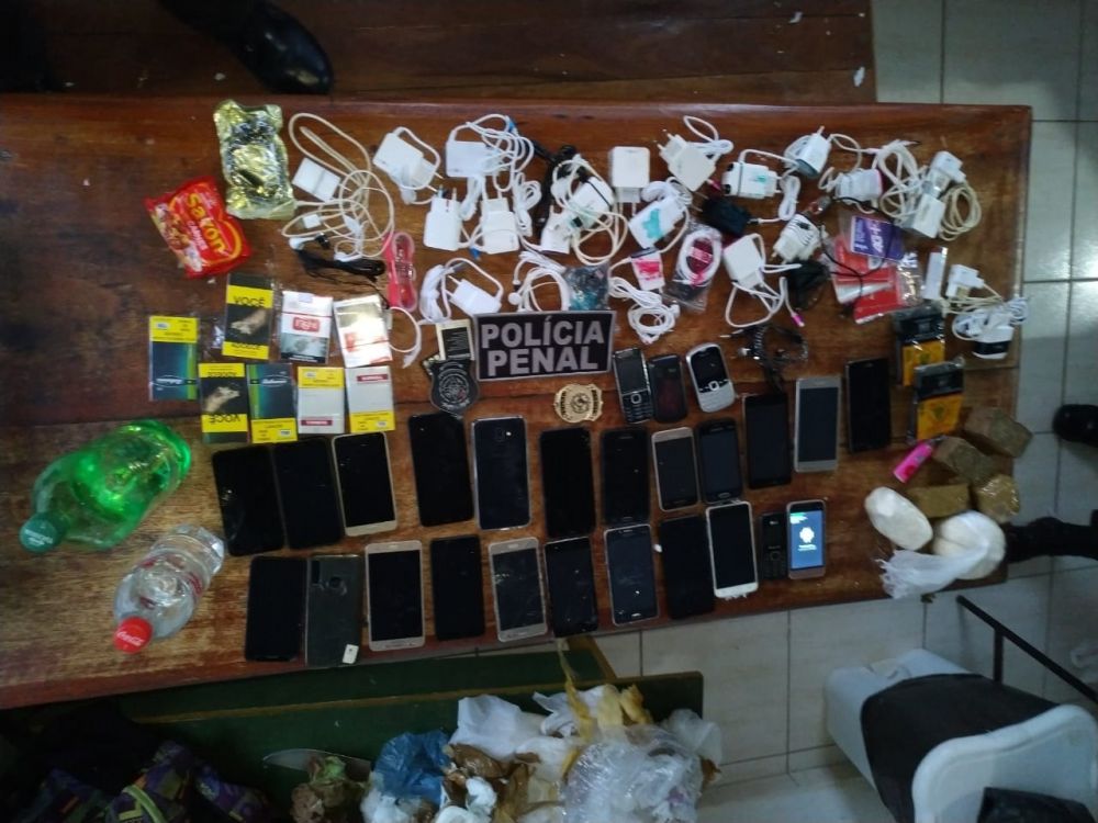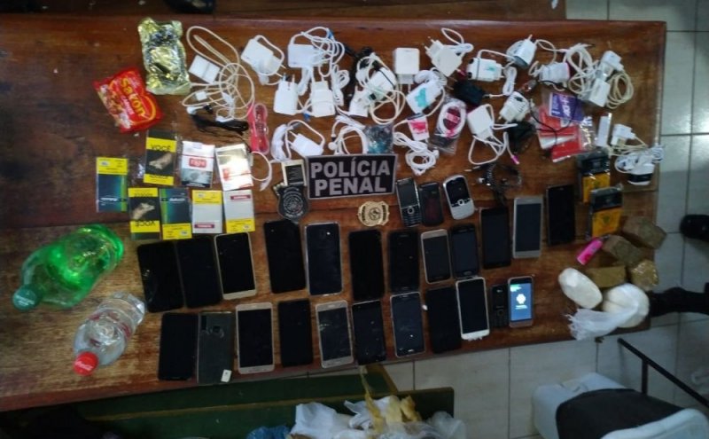 Prontamente, os Policiais Penais interviram e recolheram a bolsa. Durante a ação, os apenados revidaram, lançando objetos nos policiais. Dentro da mochila, foram encontrados dezenas de carregadores para celulares, maços de cigarros, diversos celulares e uma certa quantidade de droga.
